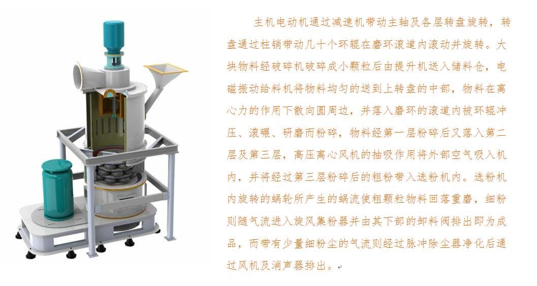 磨腔内无滚动轴承和螺钉,避免了轴承易损、螺钉松动而毁坏设备的问题。采用高效脉冲式除尘器,配置有消音器和消音房,降低了粉尘和噪声污染,环保效果极佳。