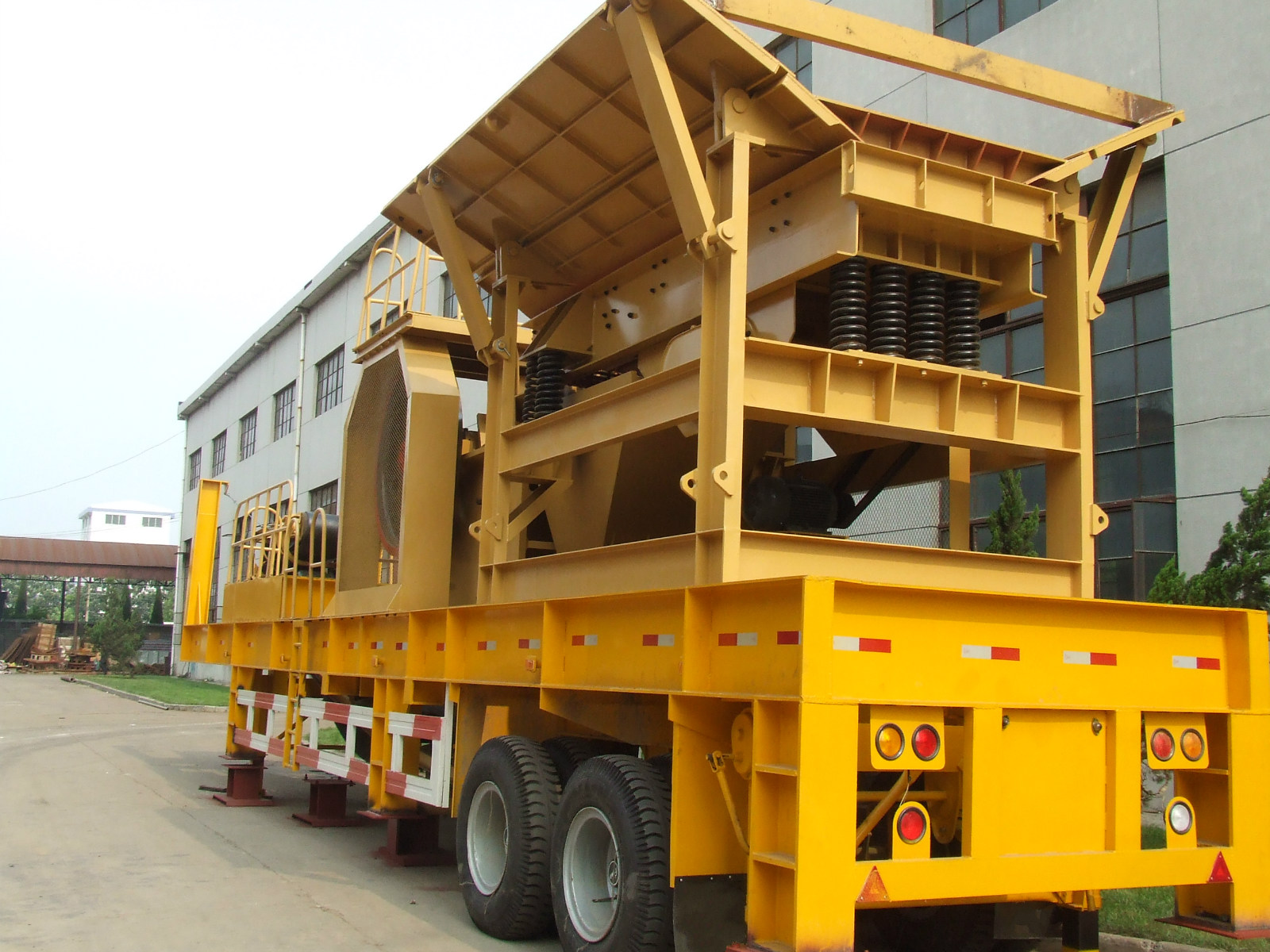 移动破碎站所有部件完全机载,包括:牢固的机架、破碎机、给料机、振动筛、传送带、电动机和控制箱等。 物料经给料机均匀输送到破碎机内(根据需要可为颚式破碎机、反击式破碎机、圆锥破碎机或冲击式破碎机等),初步破碎后,通过圆振动筛构成闭路系统,实现物料的循环破碎,成品物料由输送机输出,进行连续破碎作业。颚式移动破碎机可以根据实际生产需要去除圆振动筛,实现对物料直接进行初步破碎,与其他破碎设备配套使用操作方便、灵活。